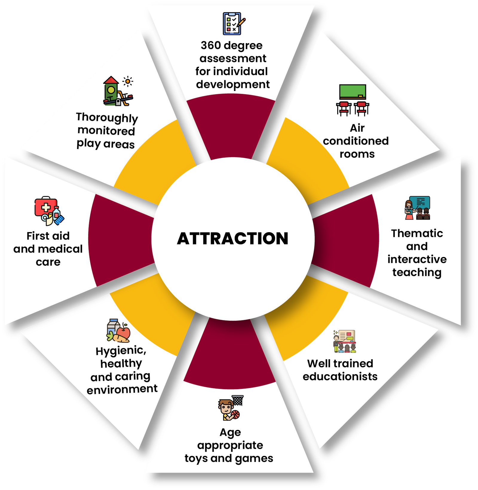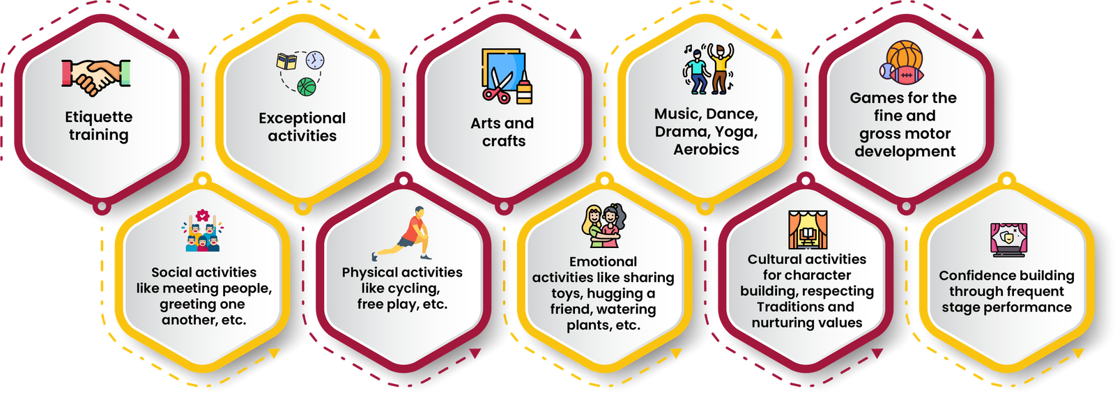 Teachers provide a friendly and relaxed environment to the children to facilitate the growth of his curiosity and learning. They also use a variety of aids that brings home the learning to the children, like flash cards, flip charts, story cards, etc. A special feature is the term wise KG day, which gives scope for Toddlers to exhibit their learning.